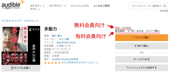 無料会員の場合は、月額料金を支払う必要がない代わりに、オーディオブックを定価でしか購入できません。一方、有料会員の場合は、付与されるコインまたは、割引価格で購入することができます。
